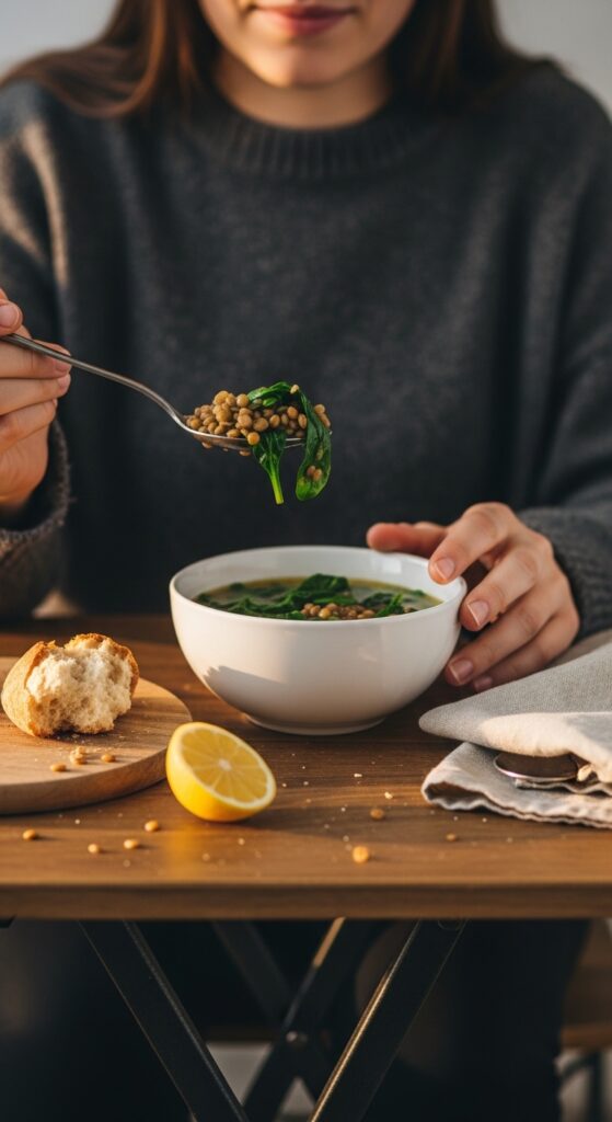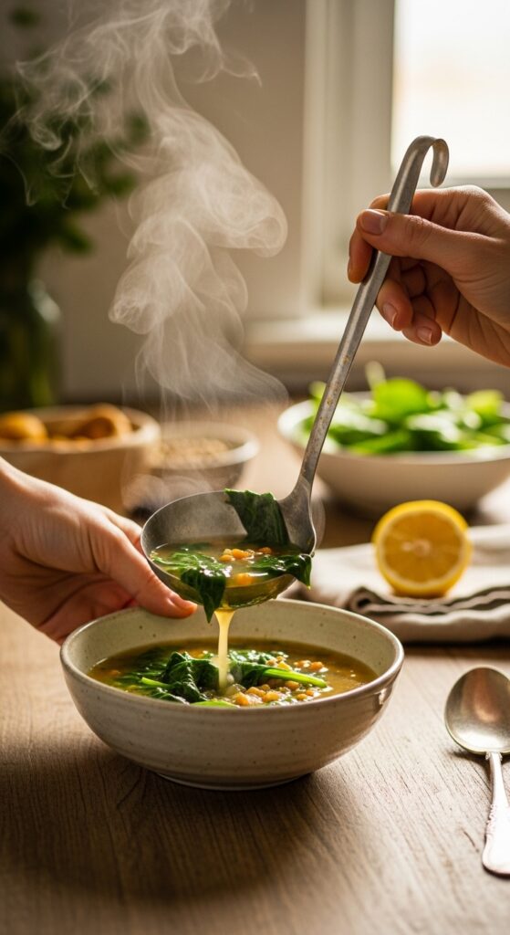 It’s simple, cheap, and ridiculously nourishing. Nothing fancy, no tricks, just real ingredients doing their best work together — soft lentils, fresh spinach, bright lemon, and a few humble aromatics that turn plain broth into a bowl of comfort.