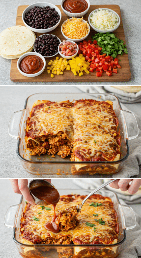 This isn’t your everyday enchilada plate. It’s got all the flavors you love—gooey cheese, tender beans, zesty sauce, soft rice—but baked into one layered, casserole-style masterpiece. No rolling tortillas one by one, no fussing with perfect enchilada shapes. Just layer, bake, and dig in.