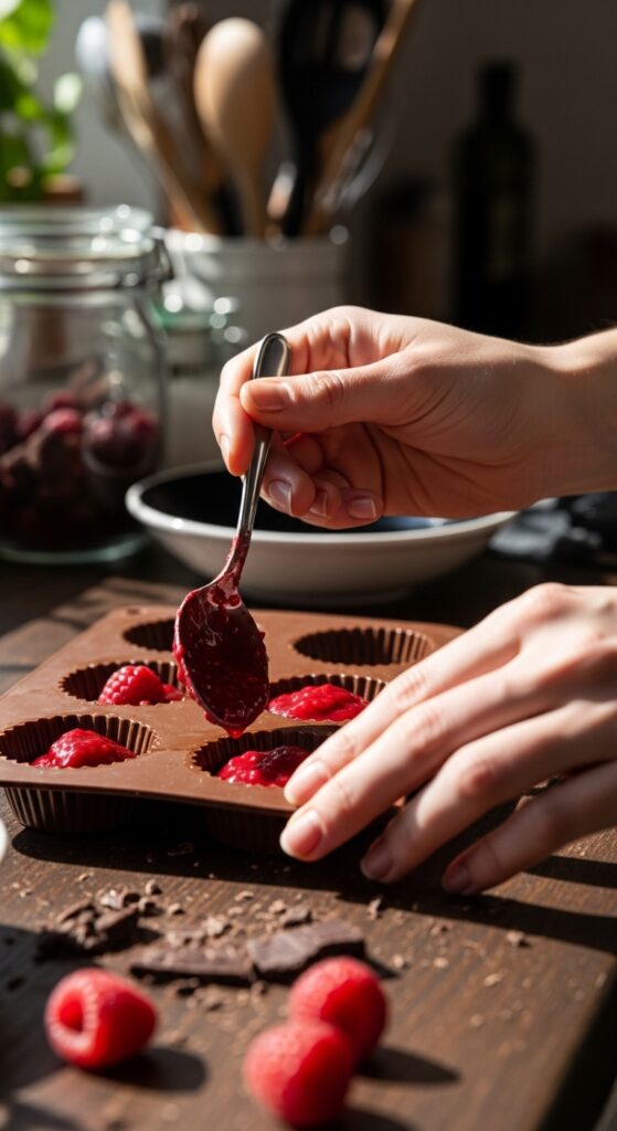 Spoon the raspberry mixture into the set chocolate shells, leaving a little space at the top for the final chocolate layer.