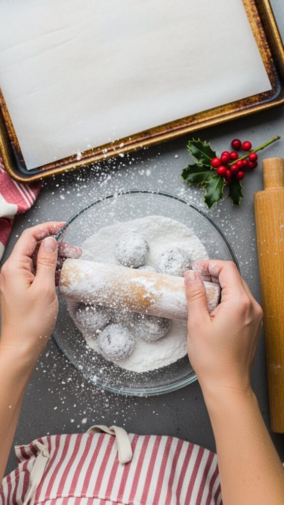 Scoop tablespoon-sized portions. Roll in granulated sugar first, then pile on the powdered sugar. Really coat them. Don’t be shy.