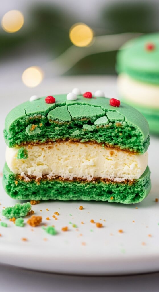 I first made these during a December snowstorm, trapped inside with too much butter, sugar, and time. I decided to recreate the flavor of those nostalgic Little Debbie Christmas Tree Cakes—light vanilla, buttery crumbs, and creamy filling—but in fancy French macaron form. It worked. It more than worked. The result was a bakery-level treat that looked straight off a Christmas dessert table and tasted like childhood dressed up for the holidays.