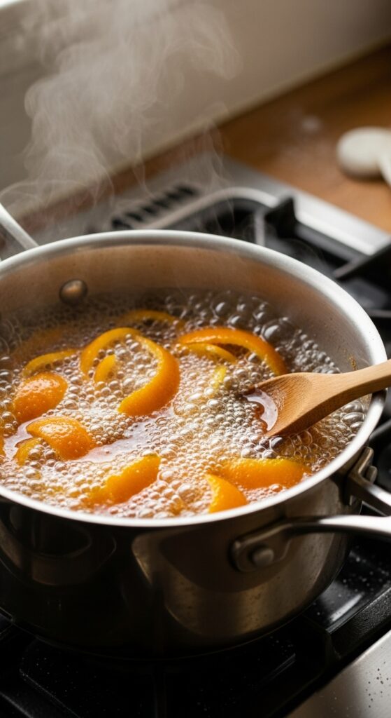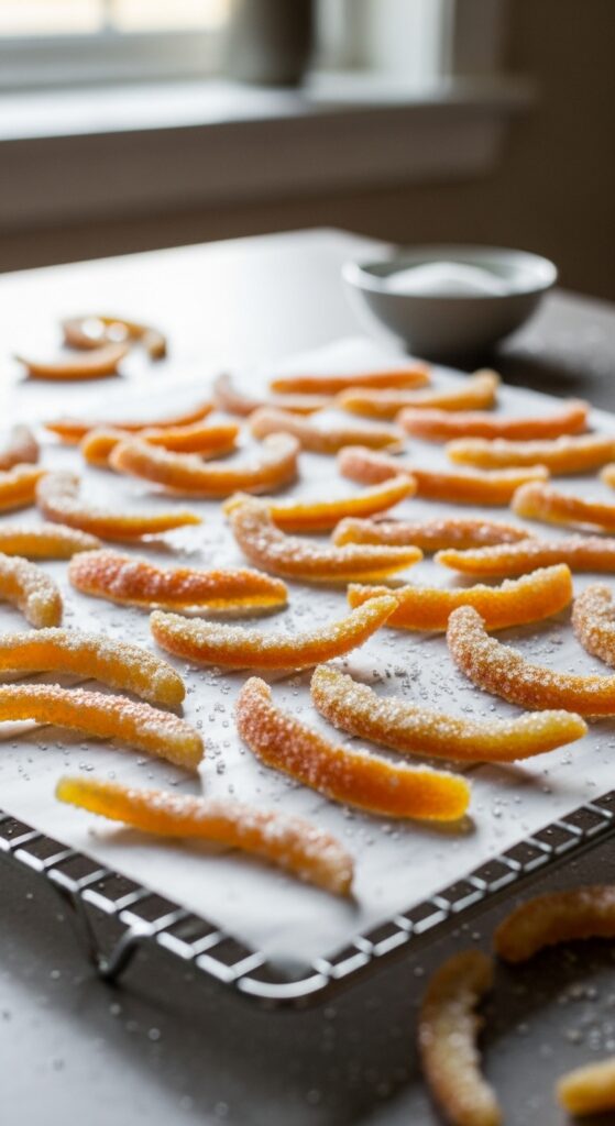 Candy-making is all about temperature and timing. Sugar behaves differently at every stage, from thread to soft-ball to hard-crack. For candied orange peel, you’re hovering around the thread stage—around 230°F (110°C). The syrup stays thick and glossy, not caramelized.