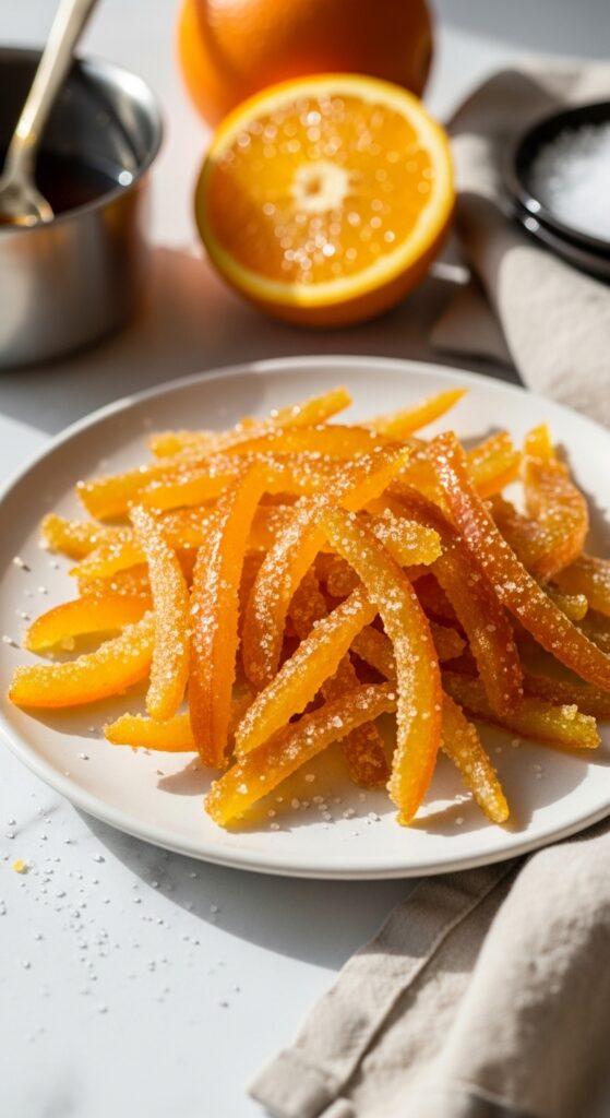 For a deeper caramel tone, swap in raw cane sugar or a bit of honey. Want it vegan-friendly? It already is. Want less bitterness? Blanch the peels twice before candying to mellow that edge.