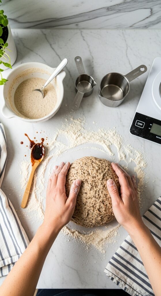 Expert Tip: Rye flour absorbs water slowly. The dough may feel sticky at first but will firm up as it rests. Resist the urge to add too much flour too soon—it needs that moisture for texture.