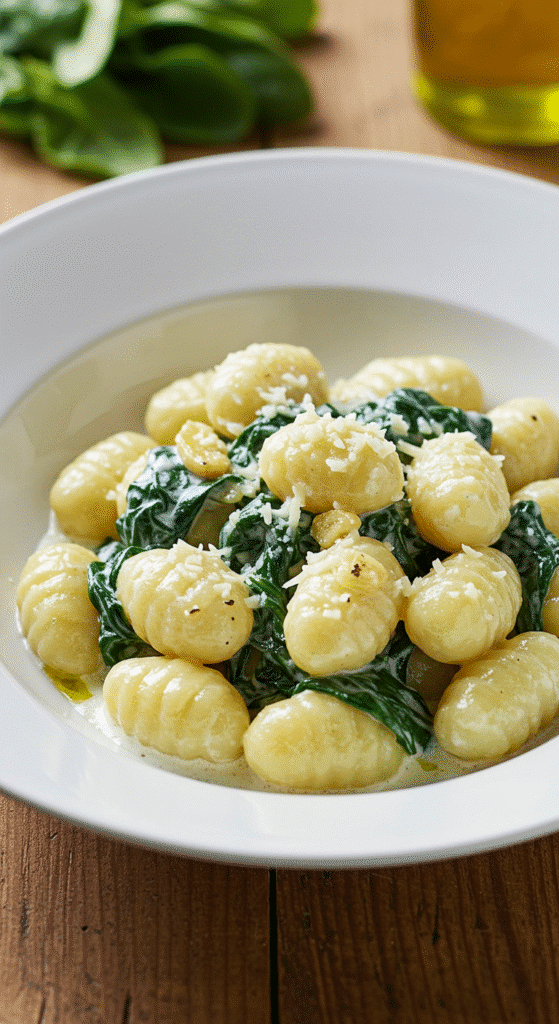 Creamy Spinach and Garlic Gnocchi Recipe loves to be plated simply. White plates make the green spinach pop. Scatter extra Parmesan on top, maybe a drizzle of good olive oil, or toasted pine nuts for crunch. A little lemon zest can lift the richness, making every bite sing brighter.
