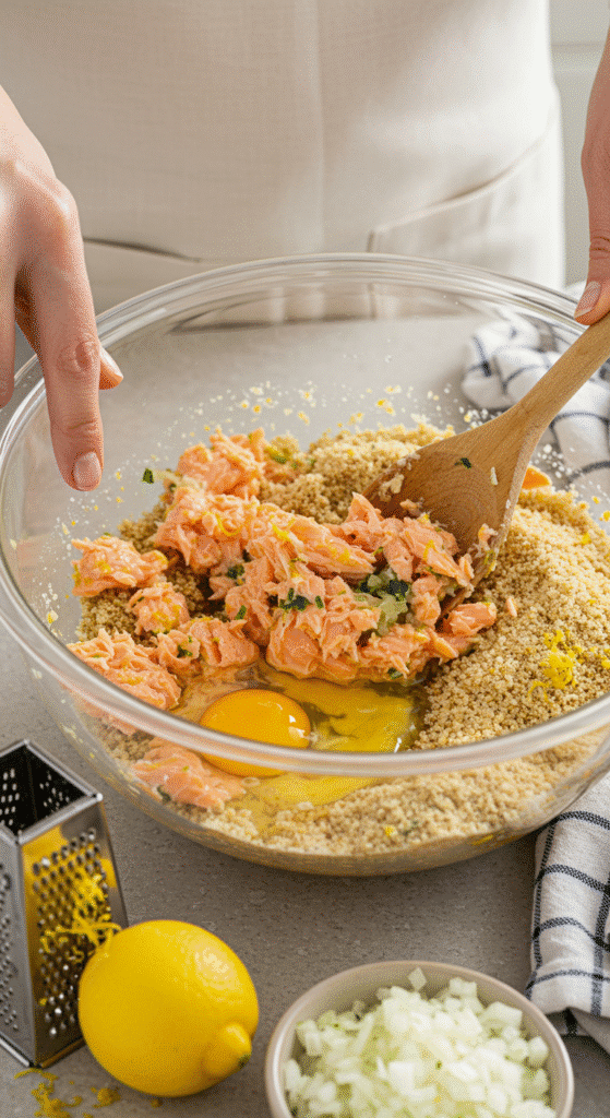 Start by mixing the base. Combine salmon, breadcrumbs, egg, onion, zest, salt, and pepper. Don’t mash too aggressively — leave some chunks of fish intact for texture.