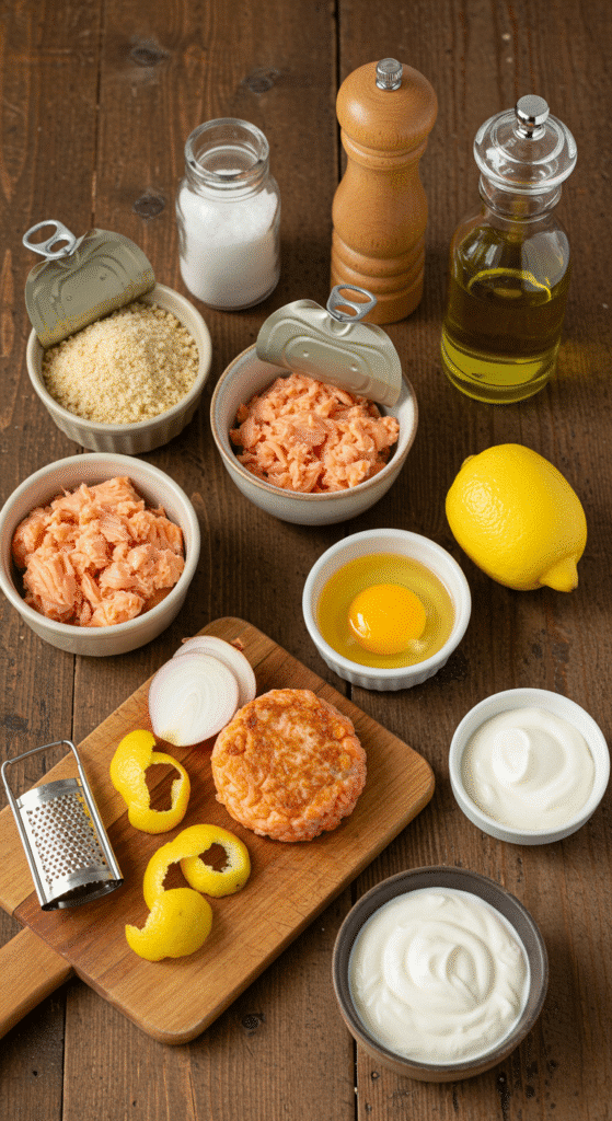 1. Prepare the Salmon Mixture: In a mixing bowl, combine flaked salmon, breadcrumbs, egg, onion, lemon zest, salt, and pepper. Mix until combined.