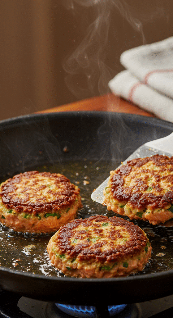 Heat oil in a skillet until shimmering. Lay the patties in gently. Don’t crowd the pan — overcrowding means steaming, not crisping. Four minutes per side gives a deep golden crust. Flip once and resist the urge to fiddle.
