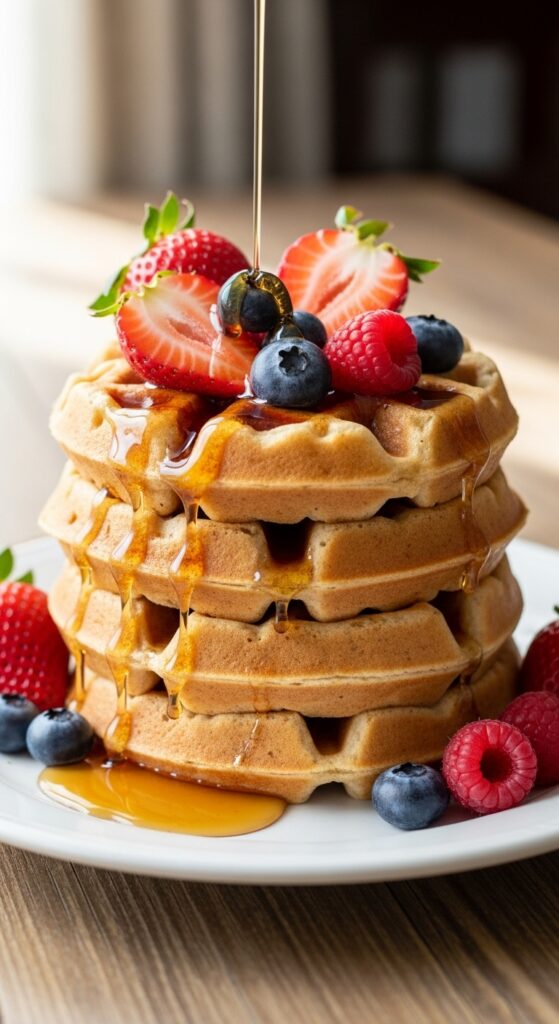 Ever had a waffle so crisp on the outside yet light and fluffy within, it practically hums when you cut into it? That’s what we’re chasing here. These Crispy Vegan Sourdough Waffles are a breakfast dream — golden, tangy, and unapologetically crunchy, finished with a glossy drizzle of maple syrup and a tumble of fresh berries.
