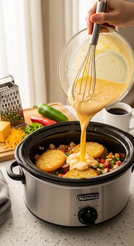 Eggs are delicate proteins that love gentle heat. The slow cooker gives them the perfect environment to thicken and set gradually, creating a creamy, custardy texture instead of a dry scramble.