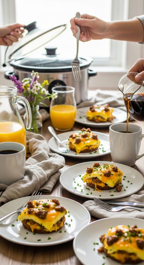 A warm breakfast table with a crockpot full of golden egg casserole, steam rising, herbs sprinkled on top, slices served beside mugs of coffee and orange juice.