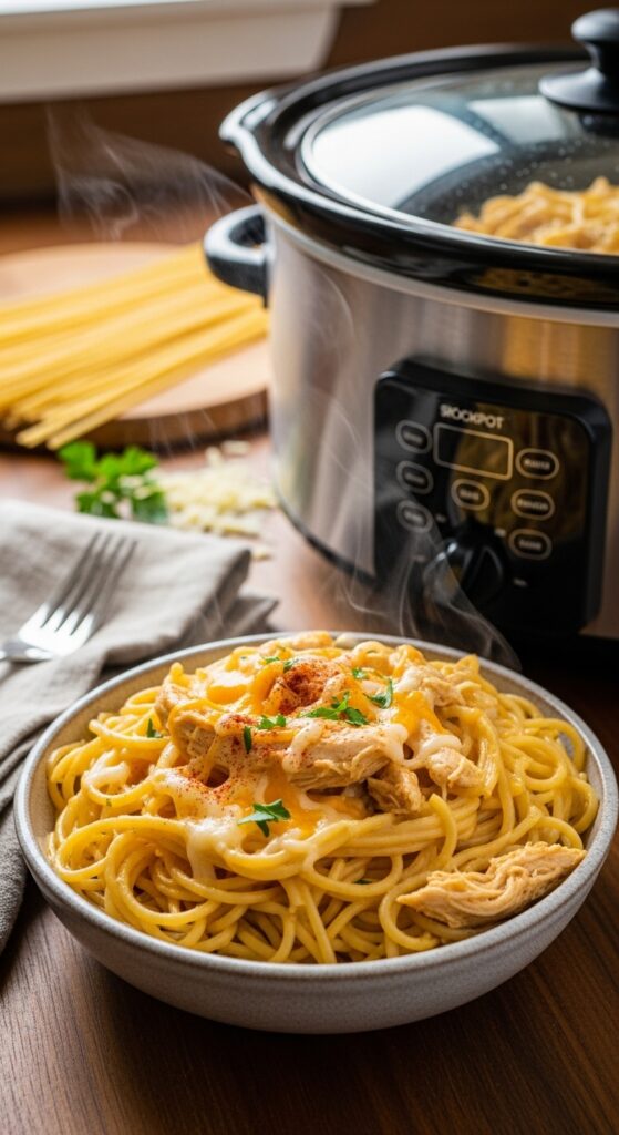This dish has a little bit of everything: the ease of a dump-and-go recipe, the slow-cooked depth of flavor you can’t fake, and the cheesy, saucy, utterly indulgent texture of a Southern casserole. It’s what happens when two comfort classics—creamy chicken pasta and slow cooker convenience—decide to have a good time together.