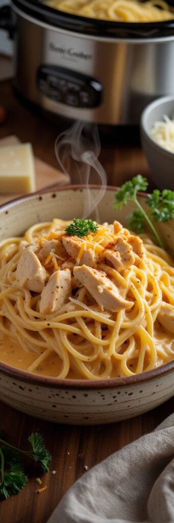 The slow cooker’s gentle heat allows collagen in the chicken to break down, keeping the meat juicy. Meanwhile, the starch from the pasta thickens the sauce naturally—no need for heavy cream or flour.