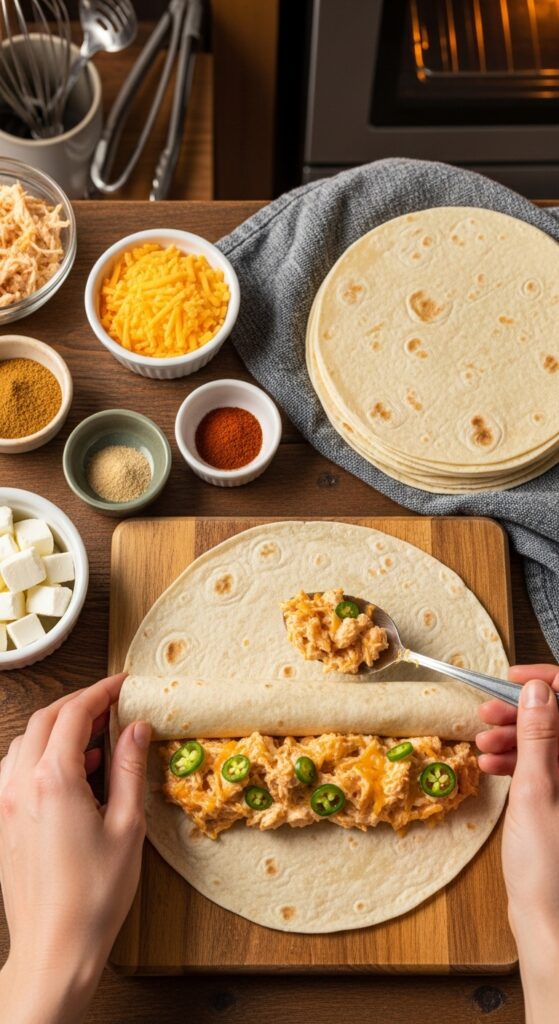 The filling stays creamy because of the balance between fat (from cheese and cream cheese) and moisture (from salsa or chilies). Too little moisture and they dry out; too much, and they steam. That’s why the filling should be thick and cohesive before rolling.