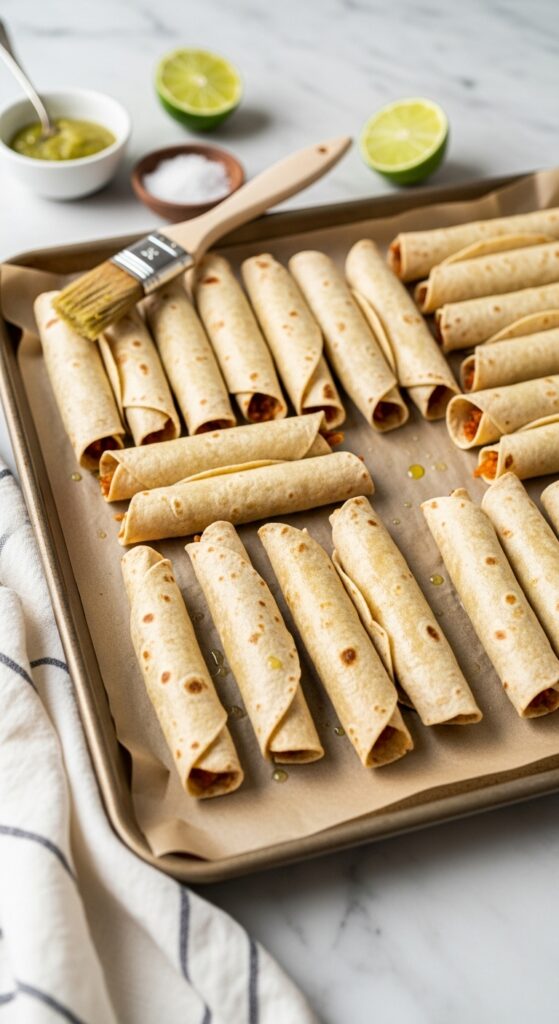 Lightly brush or mist each taquito with oil. You don’t need much—just enough to give that golden crunch. I like avocado or olive oil spray here.