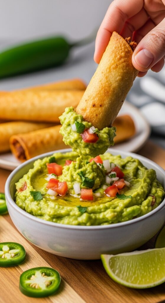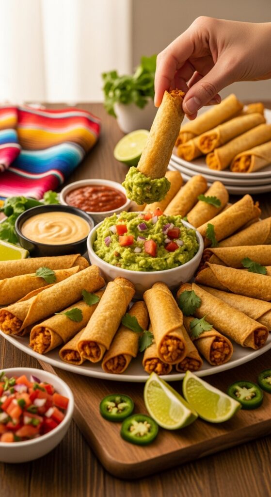No taquito is complete without dips. Classic choices include guacamole, sour cream, or salsa verde. For extra flair, mix sour cream with lime juice and a pinch of chili powder—it’s ridiculously good.