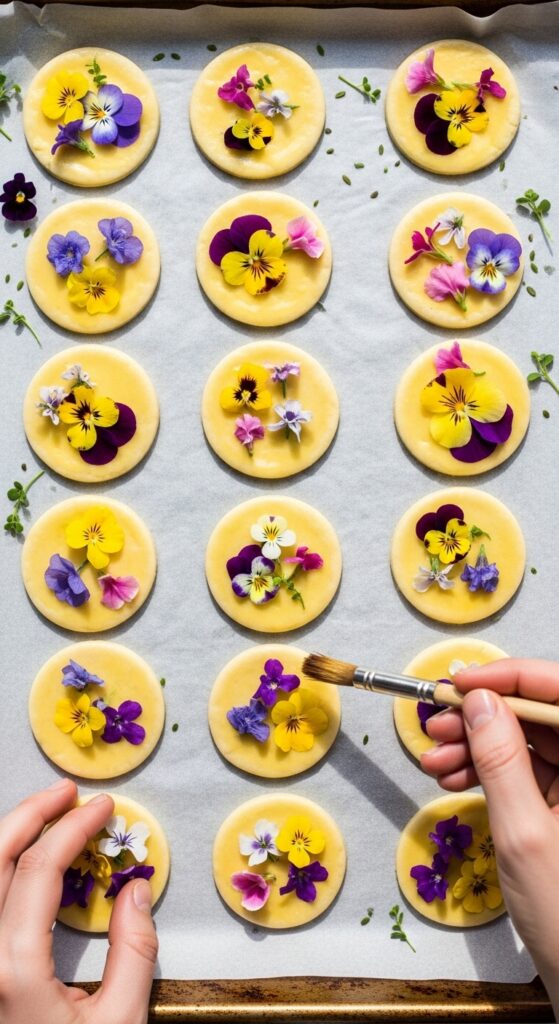 - Arrange edible flowers on each cookie. Press gently with a flat-bottom glass. Brush lightly with egg wash.