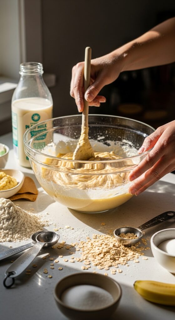 Pour the dry mix into the wet ingredients. Stir gently with a spatula or wooden spoon until just combined. If adding fruit, nuts, or chocolate, fold them in now.