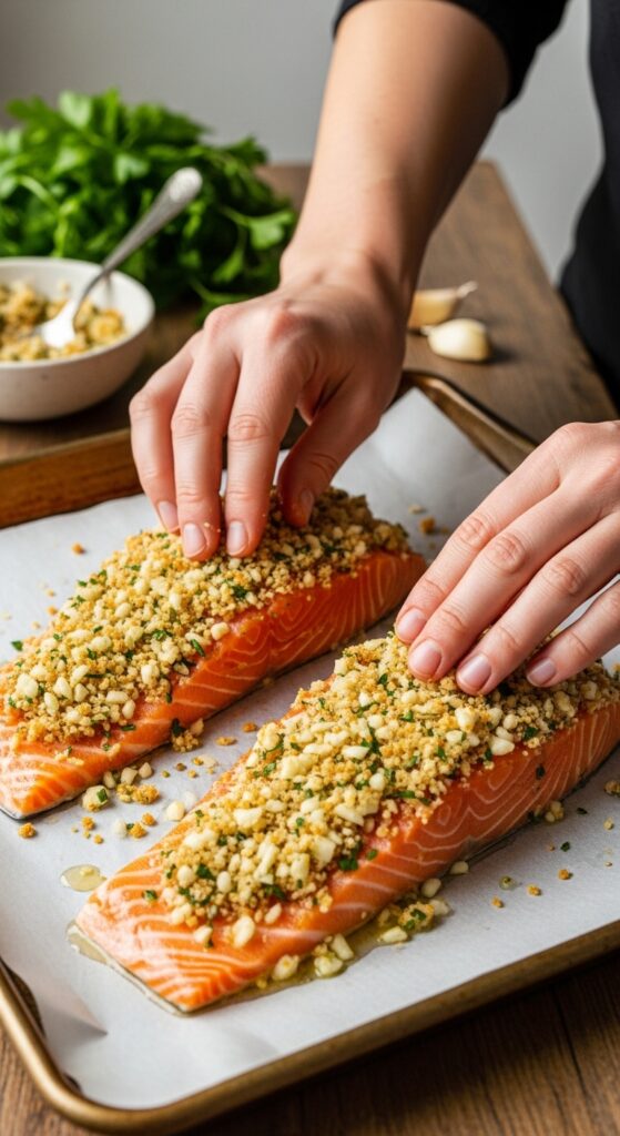 You can prep the topping a few hours in advance, but bake the salmon fresh. Once cooked, it’s best eaten right away to enjoy that crispy crust.