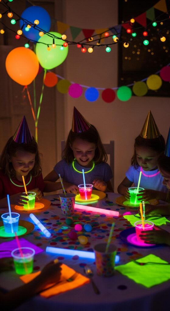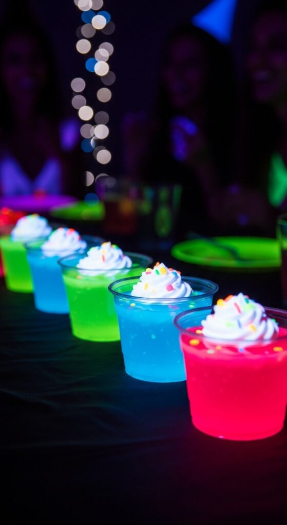 You can even create a full glow-themed dessert bar—think glowing drinks, fluorescent cupcakes, and neon-dipped marshmallows. Keep the lighting low and let your desserts steal the show.