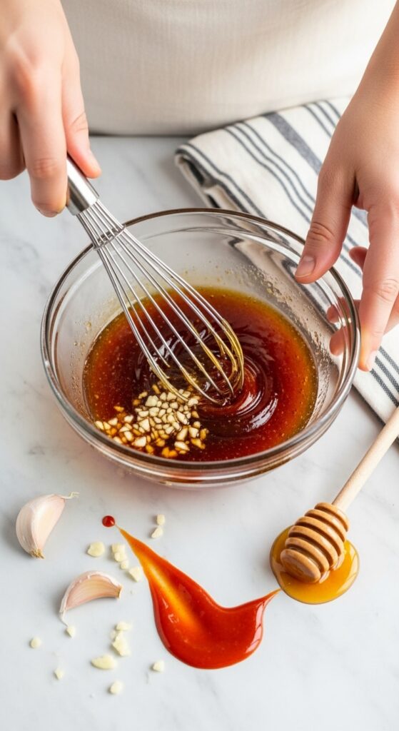 3. In a bowl, whisk honey, Sriracha, soy sauce, olive oil, garlic, salt, and pepper.
