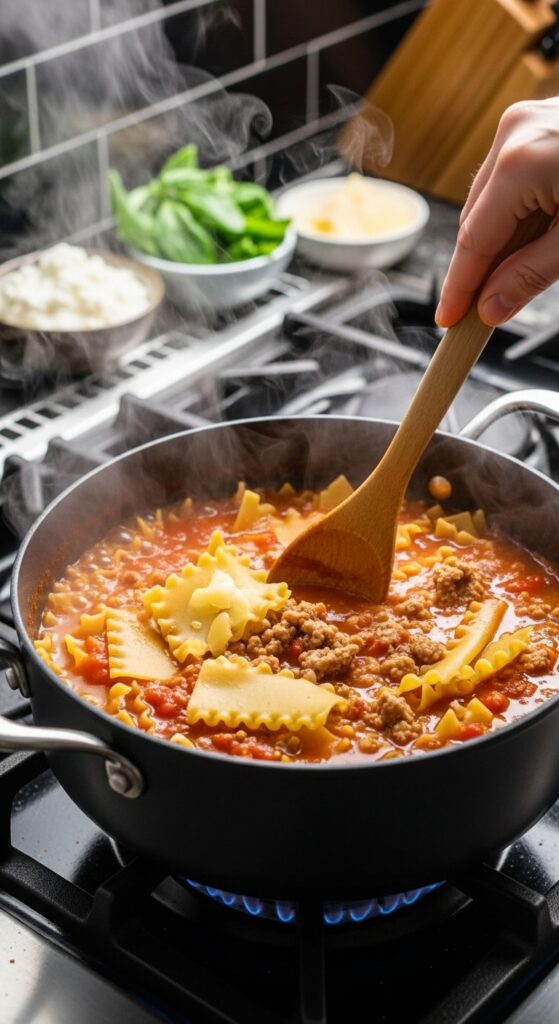 Break the lasagna noodles into rough pieces. Toss them straight into the simmering broth. Stir occasionally so they don’t stick. Let cook uncovered for about 10–12 minutes until tender but not mushy.
