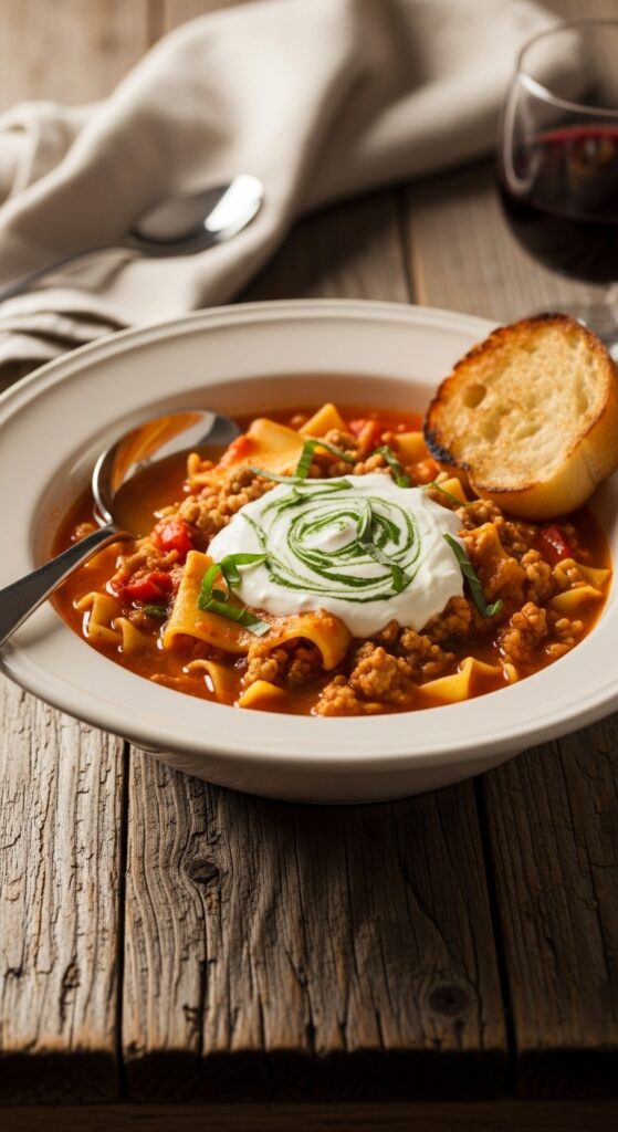 Serve this lasagna soup piping hot with crusty garlic bread or a slice of toasted ciabatta to soak up every last bit of broth. A light green salad with balsamic dressing balances the richness. For drinks, a glass of red wine—Chianti or Sangiovese—pairs beautifully, but so does sparkling water with lemon if you’re keeping it light.