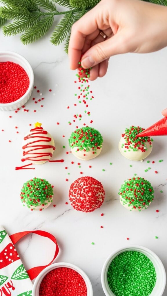 Use a fork to dip each ball. Tap the fork lightly on the bowl’s edge to shake off excess coating. Slide onto parchment and immediately sprinkle decorations before the coating sets.