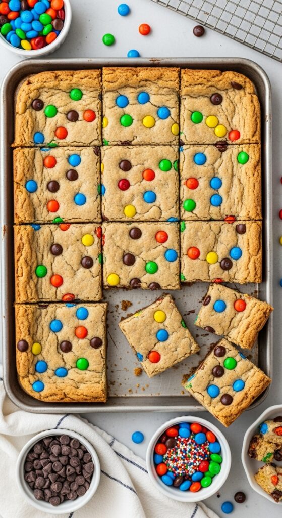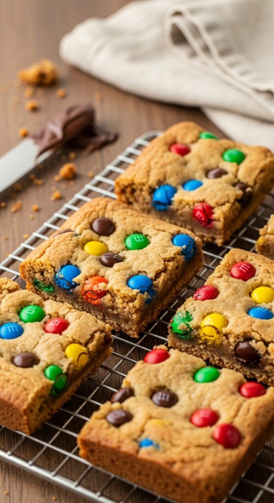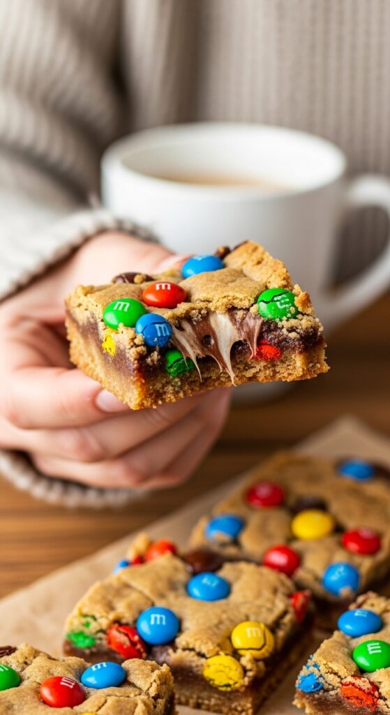 Preheat your oven to 350°F (175°C). Line a 9×13-inch baking pan with parchment paper, leaving a little overhang for easy lifting. In a large bowl, whisk together melted butter, brown sugar, and granulated sugar until smooth. Add eggs and vanilla, whisking until glossy and fully combined. Sift in flour, baking soda, and salt. Stir gently—just until combined. Don’t overmix! That’s how you get tough bars. Fold in the M&Ms and chocolate chips. The dough should be thick and slightly sticky. Press the dough evenly into your prepared pan. Sprinkle a few extra M&Ms on top for that bakery-style look. Bake for 25–30 minutes, until the edges are golden and the center looks just set. Let them cool completely before cutting. The texture gets denser, chewier, and absolutely perfect as they rest.
