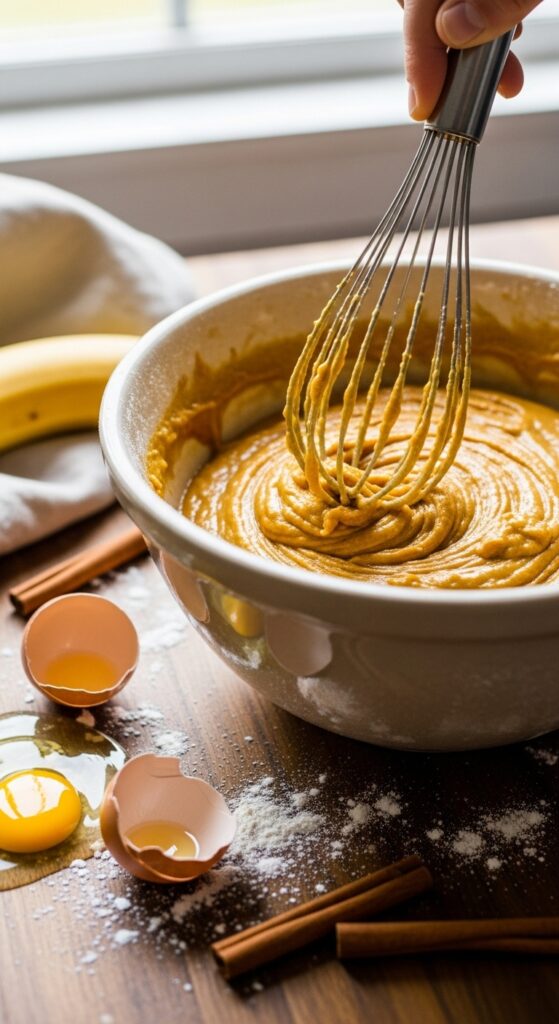 In a large mixing bowl, mash your ripe bananas until mostly smooth. Add the pumpkin purée, melted butter, sugars, eggs, and vanilla. Whisk until combined and glossy.