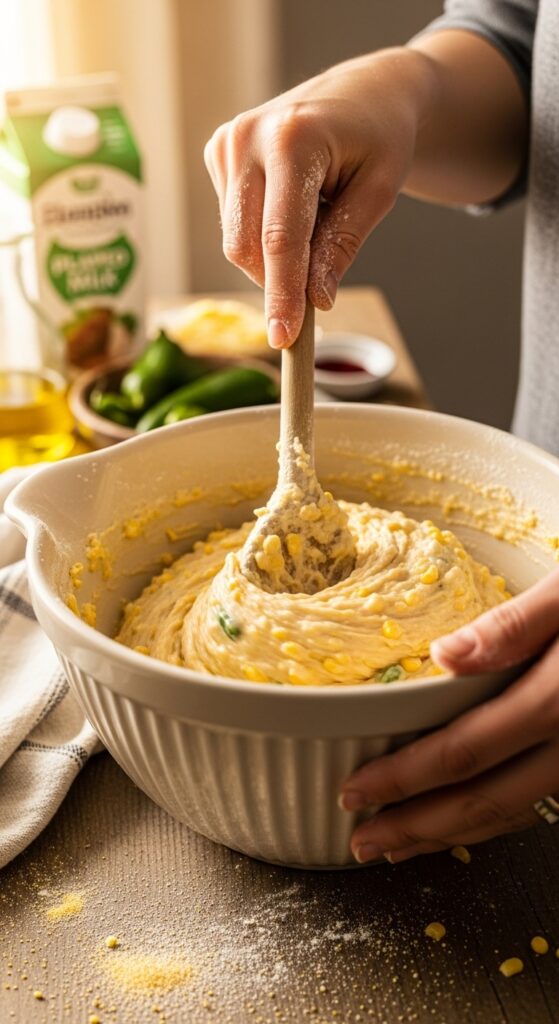 - Add the flavor stars: Fold in the corn kernels, jalapeño slices, and any herbs you’re using. The batter will look thick—that’s exactly how it should be.