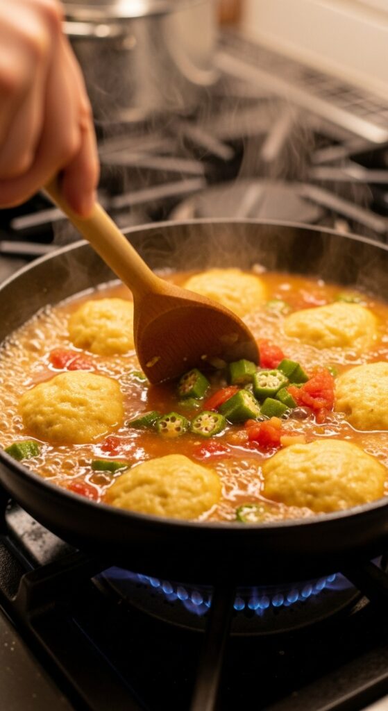 If okra isn’t in season, frozen works beautifully—just thaw and pat dry. For a vegetarian version, swap the broth for vegetable stock and skip any meat add-ins. Don’t have buttermilk? Regular milk with a teaspoon of vinegar will do the trick. If you’re gluten-free, use fine cornmeal and skip the flour in your dumplings; they’ll still be tender.