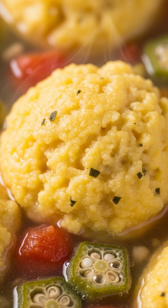 Cornmeal dumplings rely on steam, not boiling, to become tender. That’s why you never stir once they’re in. The steam builds under the lid, puffing them up just enough to stay soft but structured. If you uncover too soon, they’ll collapse. Patience pays off here.