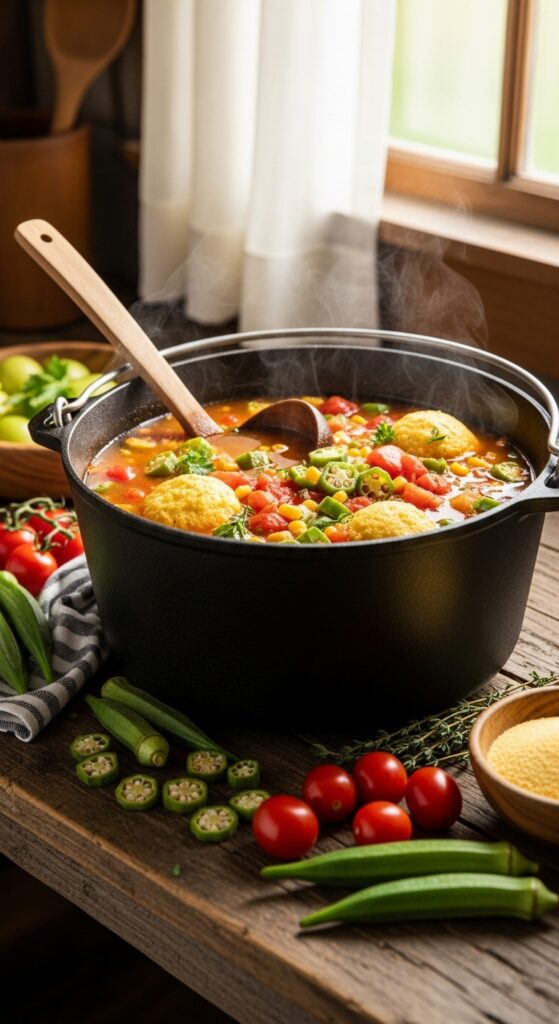 What makes this soup special isn’t just the ingredients—it’s the history tucked inside each one. Okra, originally brought to the Americas from West Africa, has deep roots in Southern cooking. It gives this soup its signature texture, that lovely, natural thickening you either love instantly or grow to love. Tomatoes add a sweet tang that balances the richness, and the cornmeal dumplings, well, they’re the soul of the dish. They soak up the broth, puff slightly as they cook, and taste like pure Southern comfort.