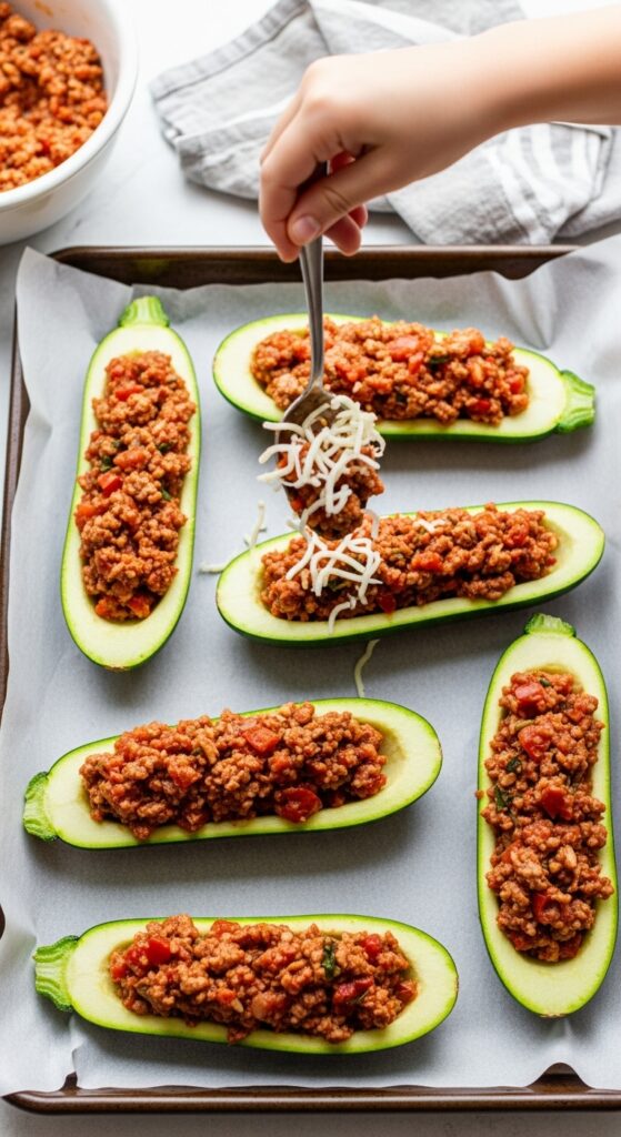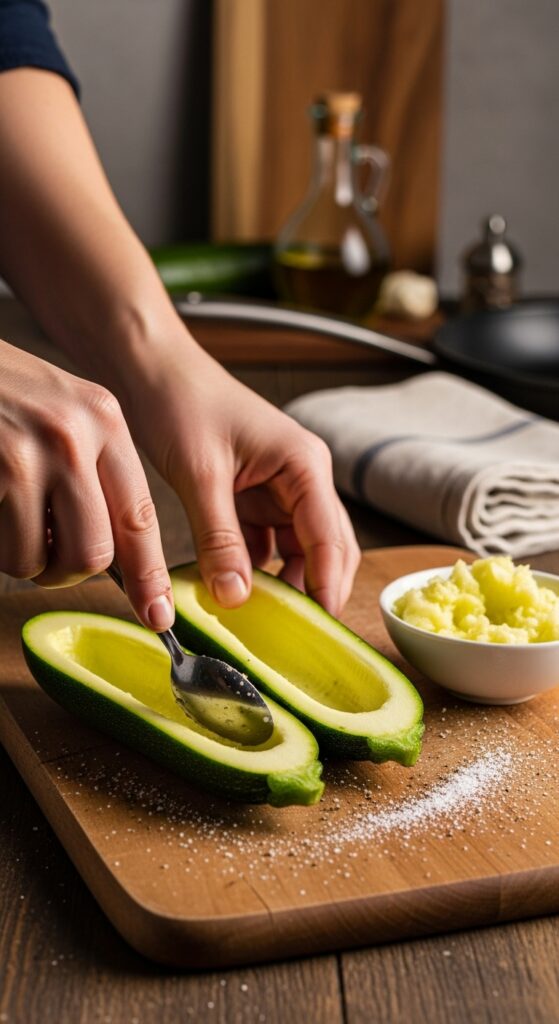 Slice each zucchini lengthwise, keeping both halves even. Using a small spoon or melon baller, scoop out the flesh to make hollow “boats,” leaving about ¼ inch of border so they hold shape. Lightly brush with olive oil, season with salt and pepper, and bake them cut-side up for 10–12 minutes at 400°F. This pre-bake step softens them slightly and removes excess moisture. Don’t skip it—it’s key for that perfect tender texture later.
