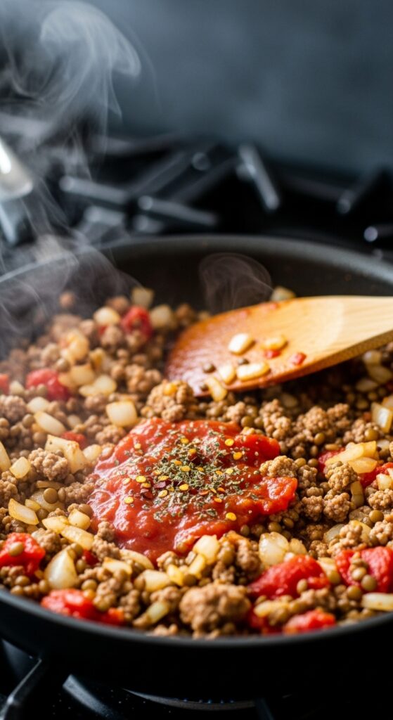 While the zucchini pre-bakes, heat olive oil in a skillet over medium heat. Add onions and sauté until translucent. Stir in garlic, then add your ground meat (or plant-based substitute). Cook until browned and fragrant. Toss in diced tomatoes, oregano, red pepper flakes, salt, and pepper. Let it simmer for about 5 minutes until it thickens slightly. Stir in breadcrumbs and Parmesan to help the mixture hold together. Add fresh herbs at the end for that bright finish.