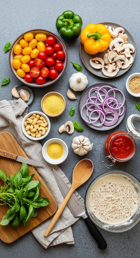 Spread sauce evenly across the dough, leaving a 1-inch border. Add dollops of cashew cheese or shredded vegan cheese, then arrange toppings as you like. Don’t go overboard—a little negative space makes a better bake.