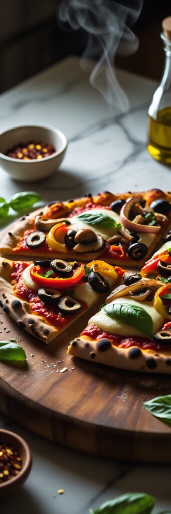 Pizza night deserves a little ceremony. Serve your vegan pizza on a wooden board or a preheated stone to keep it warm. Pair it with a fresh green salad—baby arugula, lemon vinaigrette, toasted almonds—or a bright cucumber-tomato salad.