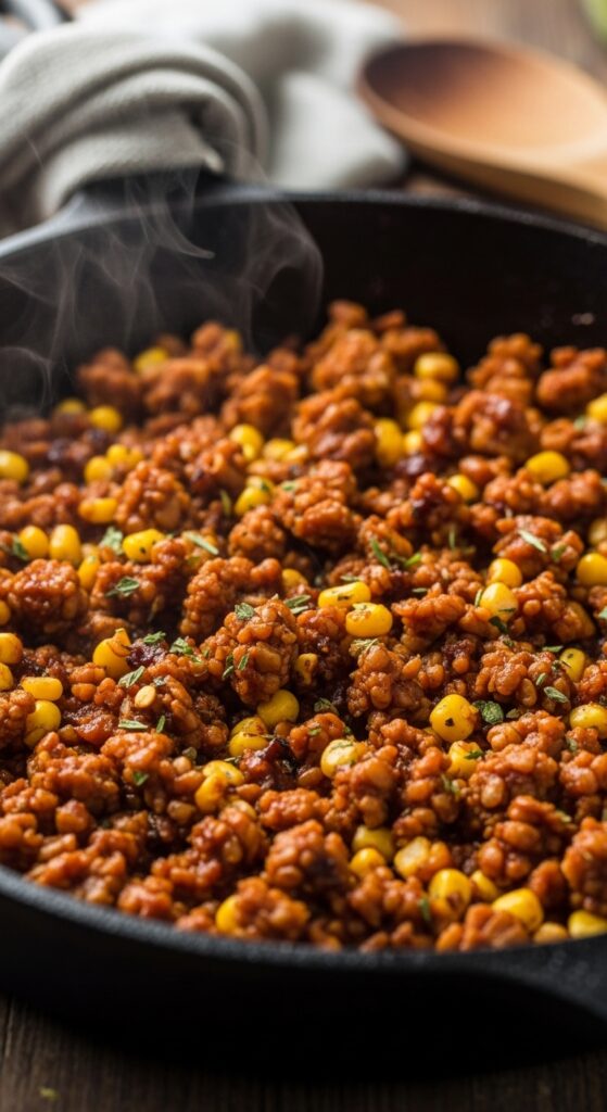 Stir in corn, tomato paste, and all spices. Toast for a minute so the spices bloom. Then add soy sauce, vinegar, and maple syrup. Cook another few minutes until everything is glossy and rich-looking.