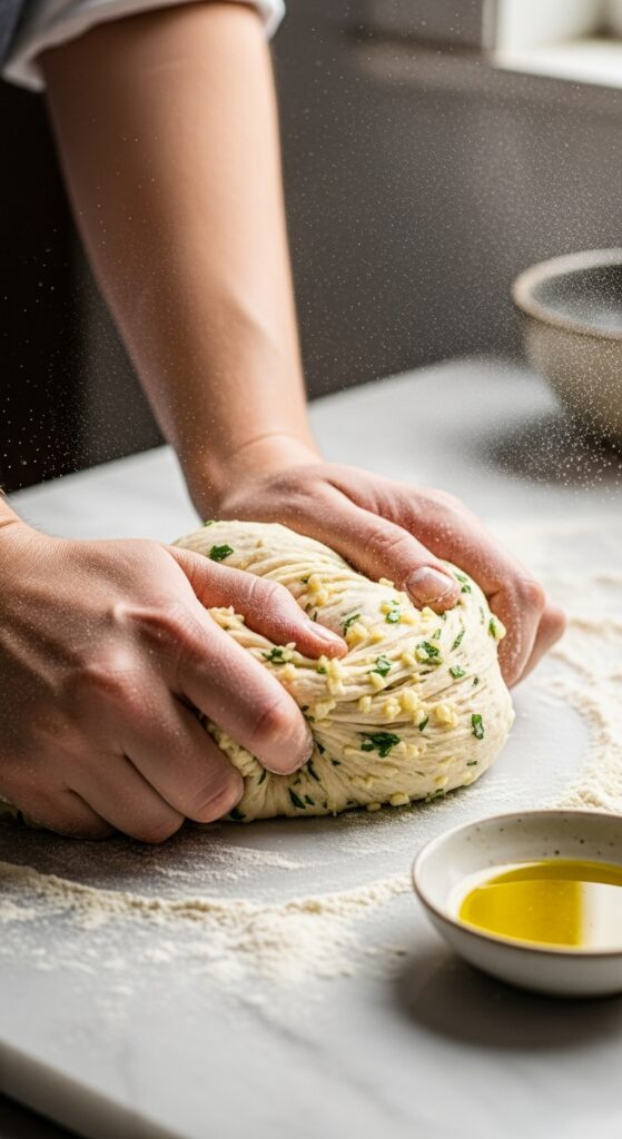 Herbs and garlic timing matters. Fresh aromatic compounds are delicate. Adding them too early in heavy kneading can smear or tear gluten strands, slightly compromising structure. That’s why I recommend adding them after initial mixing and doing only a brief knead to incorporate. Alternatively, fold them in late in the knead, gently.