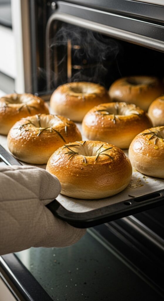 - Top & bake: Remove boiled bagels to the tray. Brush tops with olive oil; sprinkle reserved herbs, sea salt, or sesame seeds. Bake 18–25 minutes until golden and fragrant.