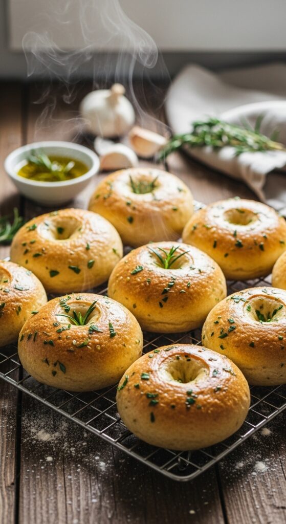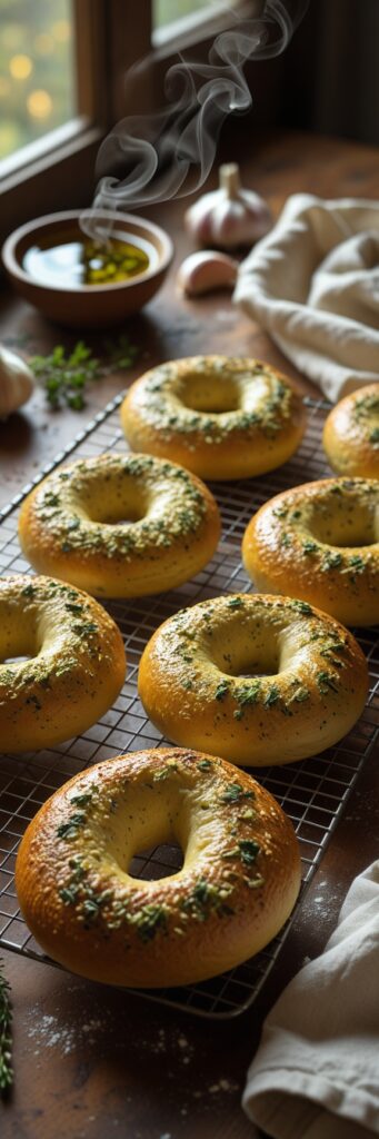 Bagels arrive from a long tradition of ringed breads across cultures—from bublik to simit. The boil-then-bake technique is a hallmark of the Ashkenazi Jewish bagel tradition. This recipe borrows that method but moves the flavor profile toward the Mediterranean with olive oil, garlic, and rosemary. The result is a hybrid that feels both comfortingly classic and pleasantly new.