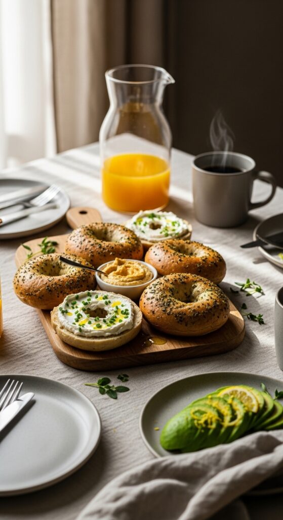 For plating, slice bagels in half and arrange on a wooden board with small bowls of toppings—vibrant avocado mash, roasted peppers, pickled red onions, and a bowl of herb oil for dipping. Sprinkle microgreens or extra herbs on top for color and freshness.