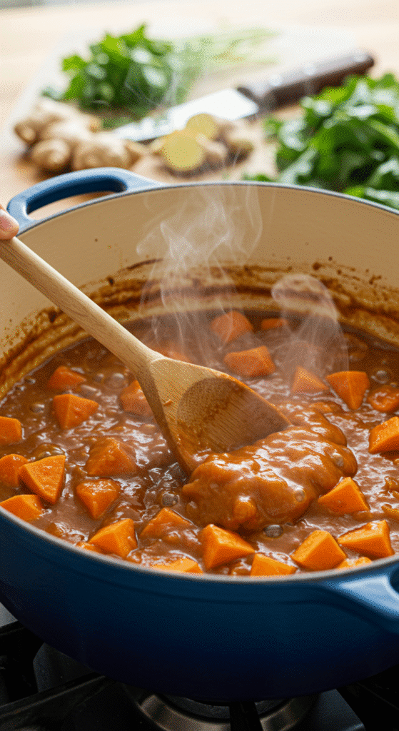 West African-Inspired Sweet Potato and Peanut Stew continues with garlic and ginger, stirred for just 30 seconds until fragrant. If you cook them longer, they turn bitter. This tiny window matters more than most home cooks realize.